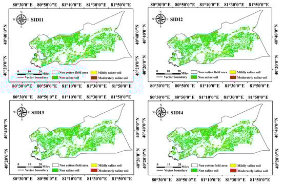 The RS salinity monitoring index models S1DI1, S1DI2, S1DI3, and S1DI4 were calculated using the formulas in Table 1, and the Jenk natural discontinuity point classification method was used to divide the value range of the above model into three saline soil grades [16] (Table 3). The soil salinization distributions of the four monitoring models were obtained, as illustrated in Figure 4.