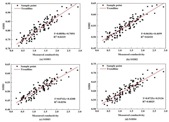In Figure 5, it can be seen that the fitting degrees of the S1D1 model, S1DI2 model, S1DI3 model, and S1DI4 model are R2 = 0.8335, R2 = 0.8310, R2 = 0.8296, and R2 = 0.8025, respectively. Moreover, it can be observed that the S1DI1 model, S1DI2 model, S1DI3 model, and S1DI4 model are positively correlated with the measured conductivity.