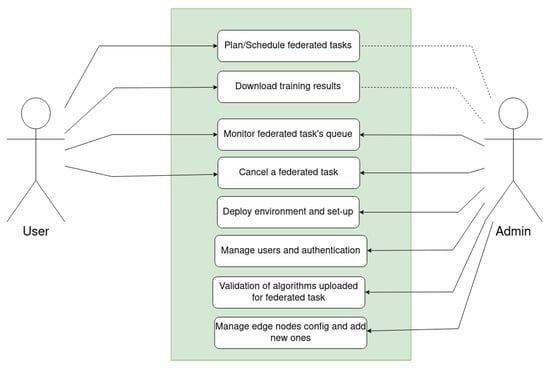The first step in designing a software solution is the definition of use cases. Use cases can be interpreted as a set of holistic functional requirements that ignore the actual implementation of the system and focus only on the interactions a potential end user may have with the system. As a FL system that should manage both the node federation itself and the execution of federated tasks, the following use cases are expected: