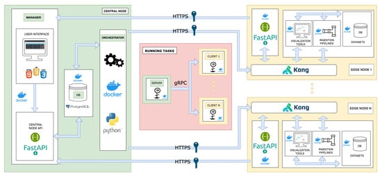 The server has the core responsibilities of the federation, it is the actor that enables manageability and usability to the system, and it is responsible for triggering upcoming federated tasks. It is made up of a manager, which is a web app with a back end directly communicated with the persistent storage service. The front-end (dashboard) together with the back-end provides user accessibility and manages the state of federated tasks. The back-end operates not only in terms of user-related actions, but also in terms of server-to-server synchronisation messages; thus, the status of a task is handled via this API as well. Moreover, the orchestrator handles and triggers all actions related to a federated task on the respective machines. It is responsible for launching computing containers on both the server and client nodes, and it also provides the queue mechanism that supports sequential execution of federated tasks.