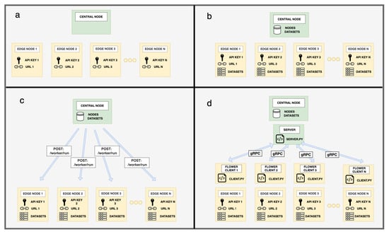 Changes in state that occur within the platform. (a) Unconnected system with all components ready to be included in the federation. (b) Connected components where the system acts as a whole and the information is stored within the central node. (c) Synchronisation of the idle system to a running state. (d) Task execution state with all computing containers launched and interconnected.
