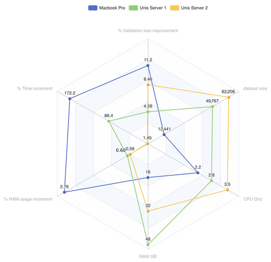 It is also worth noting that memory usage is similar for all cases, so the use of federation does not significantly increase server resource usage. This, together with the time, allows a low impact on the performance so that algorithms, which can be resource-hungry, can still use most of the memory.