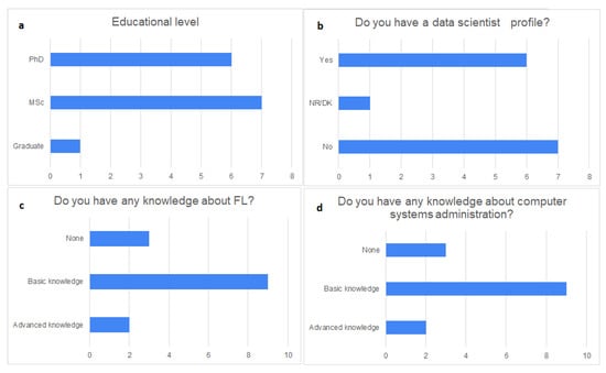 Results of the initial set of questions. (a) Educational level; (b) users with a data scientist profile; (c) knowledge about federated learning; and (d) knowledge about computer system administration.