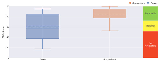 Taking into account the results obtained, we can claim that our platform presents a high level of perceived usability, as expected. The SUS score rates our solution at 84.64 (above the average of 68), which means that it has a perceived usability level higher than 95.15% of all products considered to establish the percentile scale. Moreover, with regard to the comparison with Flower, the SUS score of our platform is 40% higher and users’ opinions are less dispersed (they offer a lower standard deviation). Users consider our platform as an acceptable system and, according to their responses, they can be considered as promoters of it, contrary to their opinion about Flower, which obtains only a marginal rate in the acceptability scale, and users may act as detractors of this option. Finally, the score obtained for the industry benchmark analysis suggests that our platform is above industry standards.