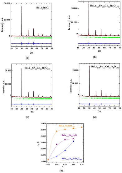The results of XRD investigations (red dots are experimental data, black line is calculated pattern, blue line is the difference curve, green symbols are calculated peak positions) for the compositions BaLa2In2O7 (a), BaLa1.85Sr0.05Gd0.1In2O6.975 (b), BaLa1.8Sr0.1Gd0.1In2O6.95 (c), BaLa1.75Sr0.15Gd0.1In2O6.925 (d), and the concentration dependencies of the lattice parameter c for the solid solutions BaLa1.9−xSrxGd0.1In2O7−0.5x (blue line), BaLa2−xSrxIn2O7−0.5x [] (orange line) and BaLa2−xGdxIn2O7 [] (violet line) (e).
