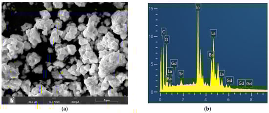 SEM (a) and EDX (b) results for the composition BaLa1.8Sr0.1Gd0.1In2O6.95.