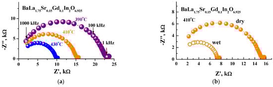 The EIS plots for the composition BaLa1.75Sr0.15Gd0.1In2O6.925 obtained at 390 °C, 410 °C and 430 °C in dry air (a) and at 410 °C in dry and wet air (b).