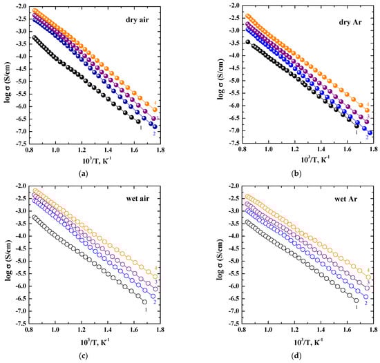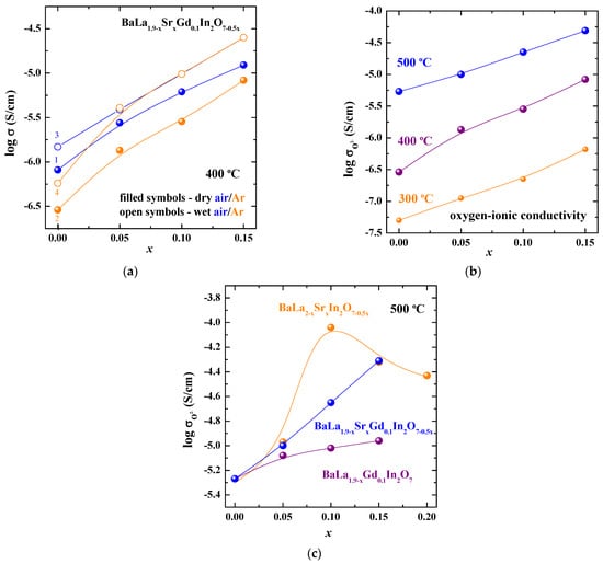 As can be seen, the changes in atmospheric humidity (pH2O variation) and oxygen partial pressure do not affect the general shape and regularities of the conductivity values changes. The increase in the dopant concentration leads to the increase of the electrical conductivity values (Figure 5a). Figure 5b shows the concentration dependence of the conductivity in dry Ar, i.e., at lower oxygen partial pressure, where the conductivity nature is predominantly oxygen-ionic. The conductivity increases with increasing strontium content, which is explained by an increase in the concentration of oxygen vacancies: