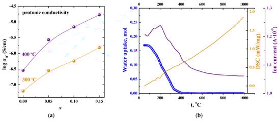 The proton conductivity values were obtained as the difference between the ionic conductivity under wet conditions (wet Ar) and dry conditions (dry Ar). The concentration dependence of the protonic conductivity for the compositions BaLa1.9−xSrxGd0.1In2O7−0.5x is shown in Figure 6a. As can be seen, the protonic conductivity increases with increasing dopant concentration. For the correct analysis of these dependencies, the values of the proton concentrations are required. Figure 6b shows the results of thermogravimetry (TG), mass spectrometry (MS) and differential scanning calorimetry (DSC) analyses for BaLa1.8Sr0.1Gd0.1In2O6.95 as an example. Mass loss occurs at the temperatures below 400 °C (TG curve) and is solely due to the release of water (MS(H2O) curve). The values of water uptake were close for all doped BaLa1.9−xSrxGd0.1In2O7−0.5x and undoped BaLa2In2O7 compositions and are about ~0.17 mol of water per formula unit (Table 1). In other words, the proton concentration () was close for all compositions. Consequently, the increase in proton conductivity () with increasing x in the formula BaLa1.9−xSrxGd0.1In2O7−0.5x is due to the increase in proton mobility ():
