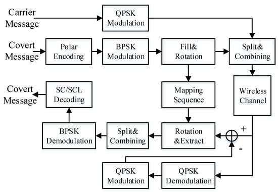 The framework of WCC-DC is illustrated in Figure 2a. The premise of WCC-DC is wireless communication physical layer with OFDM structure. In order to reduce the statistical correlation, the transmitter can divide all OFDM subcarriers into secret subcarriers or normal subcarriers. The corresponding mapping sequence is also generated. The secret information will be modulated with QPSK to obtain covert signals. Covert signal and random noise signal are superposed on the subcarrier signal. To ameliorate the undetectability of covert communication, the covert constellation will be rotated at a certain angle, as shown in Figure 2b. The transmitter and receiver should share the mapping sequence before the covert communication starts. The receiver should demodulate the carrier message as normal first. Then, the carrier message should be modulated again to obtain the ideal carrier signal. The receiver subtracts the ideal carrier signal from the received signal to get residual signals, which is the covert signal with noise. The covert signal will be rotated in the opposite direction at a certain angle and demodulated with QPSK. The covert message will be extracted from modulated signal according to the mapping sequence. However, the wireless covert channel with dirty constellation has a high BLER (Block Error Rate) when the is small. When we increase the , the undetectability will deteriorate. Therefore, we plan to ameliorate the reliability of covert messages at low with polar codes.