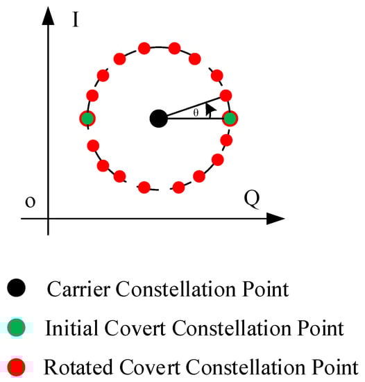 To improve the undetectability, we rotate the covert constellation point with degree with . Let us assume the coordinate of carrier constellation point is . The coordinate of covert constellation point is . When we rotate the covert constellation point, we can obtain