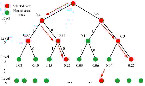 Assuming a decoding path of , the decoding process can be visualized through Figure 7, where the black paths represent the abandoned paths and the red paths indicate the adopted paths. At each node, the path metric is calculated, and the two paths with the smallest are chosen. This approach enables simultaneous maintenance of multiple code paths, thus ensuring the SCL code entry local best-generated code.