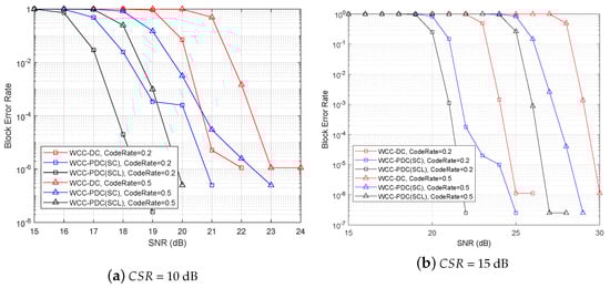 As depicted in Figure 9a, the BLER of the wireless covert channels decreases as the code rate decreases to 0.2. It is worth noting that the represents the ratio between the secret carrier signals and noise signals. WCC-PDC exhibits lower BLER compared to WCC-DC with BCH code. Specifically, at = 18 dB, which is a normal value, the BLER of WCC-PDC with SC decoder reaches 0.02, and the BLER of WCC-PDC with SCL decoder reaches 1 . Moreover, even at = 18 dB, a low BLER of 0.03 can still be obtained by utilizing WCC-PDC with SCL decoder.