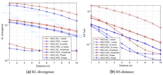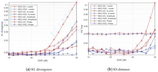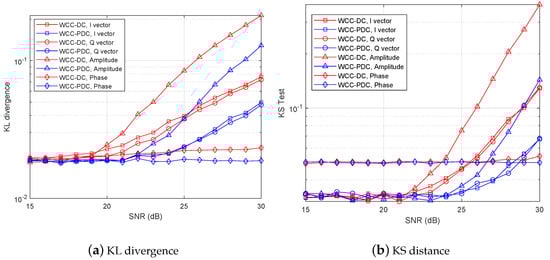 In Figure 10a,b, we investigate the impact of the distance between Alice and Willie on undetectability. The of the received signal at Bob is kept at 20 dB, and the of the signal is set at 10 dB. As shown in Figure 10a, the KL divergence decreases with increasing distance between Alice and Willie. When the distance between Alice and Willie is greater than 5 m, the KL divergence of phase reaches a threshold and no longer changes, while the KL divergence of I vector, Q vector, and amplitude decrease with increasing distance. It can be observed that WCC-PDC can achieve better undetectability than WCC-DC, and our proposed WCC-PDC strategy can significantly improve the undetectability of covert communication.