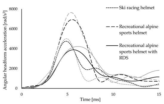 The ski racing helmet also significantly (p = 0.006) reduced mean peak angular acceleration compared to the recreational alpine sports helmet with no RDS by approximately 33%. This finding may be attributed to the difference in vent location on the helmet shells. The crown of the ski racing helmet shell was smooth with only small circular vent holes at the rear of the helmet, whereas the recreational alpine sports helmets, both with and without RDS, had large vent holes at the crown and rear of the helmet. The crown of the helmets was the target impact site for the tests in the current study; however, impacting a different site (e.g., rear) may have resulted in different peak angular accelerations. Helmets are typically designed with smooth outer shells, which lowers the friction between the helmet and the impacted surface and, therefore, decreases the tangential forces and angular acceleration of the head [34,38]. Substantial variations in peak angular headform acceleration have been previously reported in oblique impact testing of motorcycle helmets, which was attributed to interactions between the helmet vent and the high friction surface of the angled anvil [39].