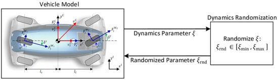 Dynamics randomization scheme at the beginning of each training episode for a representative dynamics parameter . First, the parameter which should be randomized is selected and forwarded to the dynamics randomization module (top arrow). Afterwards, the randomized value of the parameter is returned to the vehicle model (bottom arrow).