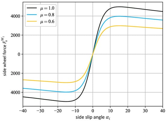 The side wheel forces over the side slip angle for different values of with denoting the front or rear wheels, respectively, according to Pajecka’s MF [] in Equation (A14).
