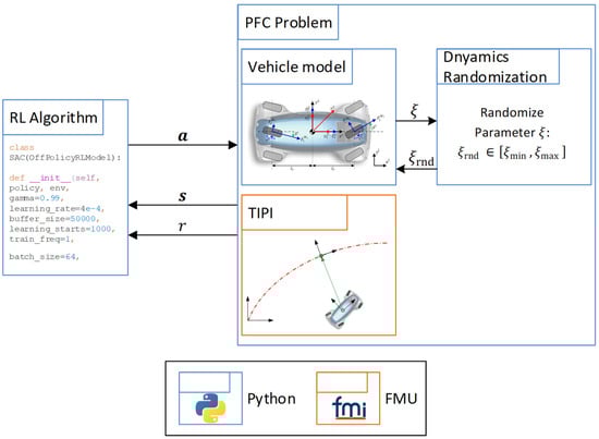 Artificial intelligence has accelerated the development of autonomous vehicles, notably over the past decade [,]. It has successfully been applied for several autonomous driving tasks, including motion planning [,] and motion control []. Especially the application of reinforcement learning for motion control has gained increasing interest, where so-called agents are trained to approximate optimal control policies [,]. Agents for safety-critical applications, such as autonomous driving, are often trained in simulation, where a learning model of the system needs to be provided. This allows a safe training of agents without risking dangerous accidents involving humans or the destruction of the real-world system, which is especially important since the agents explore different and possibly unsafe actions during training in order to find an optimal control policy. Additionally, training in simulation is fast and scalable. After the training process is successfully completed, agents are then transferred to and executed on the real-world system. However, agents often show poor results during execution if specific dynamics parameters of the learning model are uncertain at training time or if they differ from the actual values of the system due to an inaccurate system identification process []. Furthermore, parameter values might change and vary over time due to environmental influence. In the case of autonomous vehicles, these issues often occur since it is not possible to determine the values of specific dynamics parameters beforehand that will be valid for every driving scenario. For example, an agent can be trained with the nominal vehicle mass and perform well in this particular use case. However, the performance of the agent might decrease drastically if humans or a heavy load are onboard, since this additional load changes the dynamical behavior of the system. Similarly, the tire-road friction depends on the current weather condition and frequently changes over time. On a sunny day, the road-tire friction will be higher than on a snowy one. These uncertainties need to be considered in the learning model to enable the training of robust agents for the application of motion control tasks for autonomous driving.
