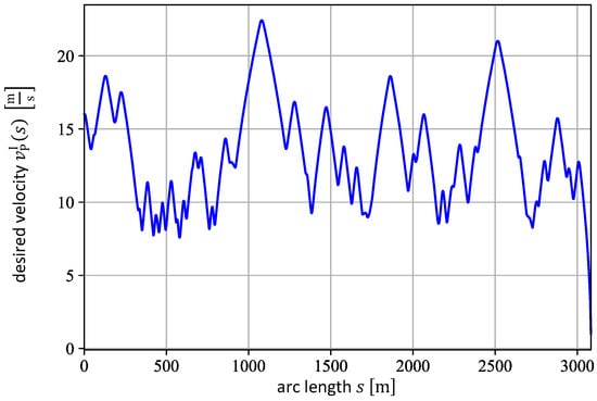 The agents are trained on the path depicted in Figure 6, which represents a federal highway called “Kesselberg”, located in the German Alps, and is parameterized by the arc length . The corresponding desired velocity profile is shown in Figure 7, calculated by taking the path curvature and the vehicle’s acceleration limits into account []. This particular path is chosen for training since it consists of road sections with different characteristics, which are beneficial for learning the RL-based PFC. In Figure 6 and Figure 7, for example, it can be seen that the path demands tight turns between the arc lengths and (cf. Figure 6) with a rather slow velocity around (cf. Figure 7). On the other hand, the path section between and represents an almost straight road, where the vehicle needs to accelerate quickly to successfully track the velocity demanded. All agents are trained for a total of time steps with a step size of , and the reward function introduced in Equation (5). In this work, an episode consists of time steps. During training, we apply the state-of-the-art Soft Actor-Critic (SAC) [] learning algorithm from the Stable-Baselines 2 library []. The SAC algorithm is briefly discussed in Appendix C. The training with the SAC method is conducted with the hyperparameters given in Appendix D. The parameters of the reward function introduced in Equation (5) are set to:
