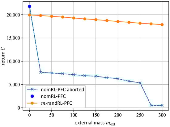 To evaluate the robustness and compare the performance of the nomRL-PFC and the -randRL-PFC, both agents are executed several times on the path in Figure 6, where each time a different external mass is chosen within the interval , i.e., the interval on which the agent with dynamics randomization was trained. The returns both agents obtained during these executions are shown in Figure 8. Here, the dark blue dot represents the return of the nomRL-PFC for the external mass . The light-blue dashed line with the crosses represents the nominal agent’s returns for executions on the path that were aborted due to early termination (cf. Inequalities (17)). The orange line shows the return of the -randRL-PFC for all external masses .