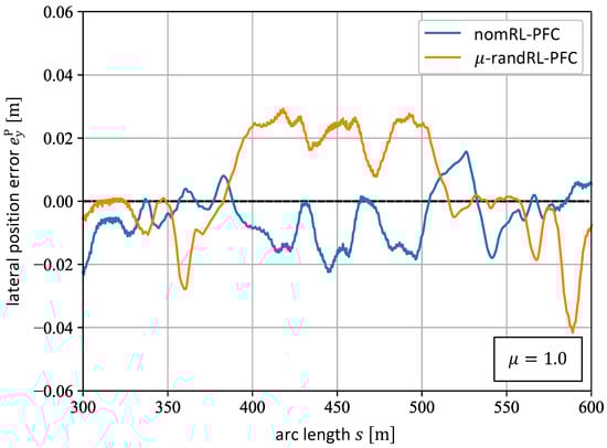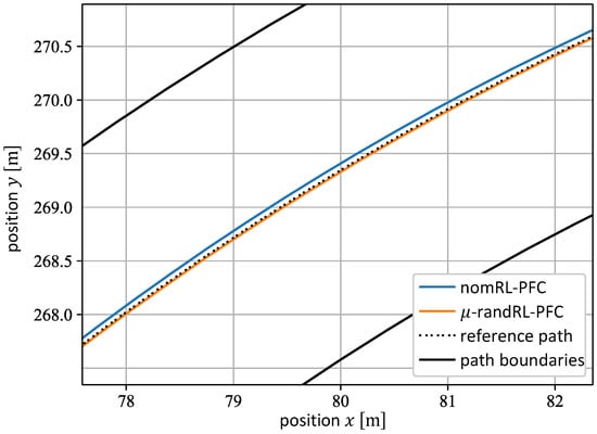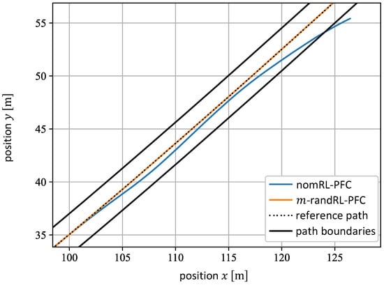 In Figure 8, it can be seen that the nomRL-PFC achieves a higher return than the -randRL-PFC for , which is the value for which the nomRL-PFC was trained. However, the -randRL-PFC outperforms the nominal agent for cases in which . In all cases with an additional mass, the execution of the nominal agent on the path is aborted early because it triggers one or more of the safety-critical termination conditions introduced in Equation (17). In the case of , for example, the execution of the nomRL-PFC is aborted because the position error exceeds the respective pre-defined threshold, i.e., (cf. Inequalities (17)). This is illustrated in Figure 9. Here, the pathway of the nominal agent is depicted in blue, while the pathway of the -randRL-PFC is depicted in orange. The reference path is presented by the dashed black line. The solid black lines represent the path boundaries. It can be observed that the nomRL-PFC starts to slightly deviate from the reference path until the agent eventually leaves the road. However, the -randRL-PFC continues to successfully follow the path closely. Furthermore, for the complete interval of the values considered for , the returns of the -randRL-PFC remain at a relatively high level compared with the nomRL-PFC’s returns, which decrease continually. This underlines the robustness of the -randRL-PFC against varying mass values.