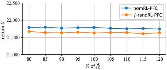 To examine the robustness of the nomRL-PFC and the 𝐽-randRL-PFC against variations in the yaw inertia, both agents are executed on the training path several times, where each time a different value for is chosen according to the inequalities (13). The returns of both agents are shown in Figure 10, which are evaluated at of the nominal inertia value of the ROboMObil. The blue line represents the returns of the nomRL-PFC, whereas the orange line depicts the returns of the 𝐽-randRL-PFC.