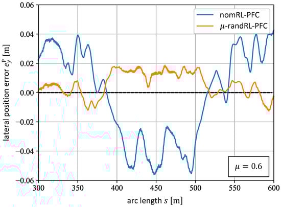 Furthermore, in Table 3, it can be seen that the nomRL-PFC outperforms the -randRL-PFC in terms of tracking the demanded velocity. For both friction values, the -randRL-PFC generates a higher RMS of over the entire path. This can be explained by the hierarchical design of the reward function. It prioritizes the minimization of the position error before rewarding small velocity errors. This prioritization motivates the -randRL-PFC to apply a rather conservative velocity tracking performance for all friction values as a trade-off for good position tracking. Therefore, the agent trained with friction randomization applies a slower velocity for the different friction values in order to track the position more successfully for any given friction value .