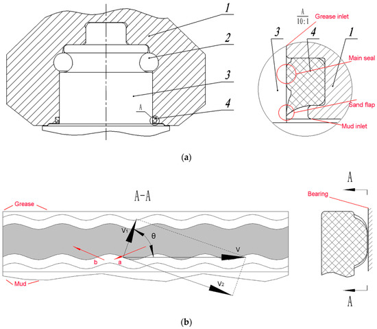 Corrugated wedge sand retaining seal structure diagram of roller cone bit: (a) Assembly drawing, and (b) Circumferential development view of main seal. 1—roller cone, 2—steel ball, 3—tooth palm, 4—new type of sealing ring.