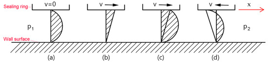 As shown in Figure 2, there is a pressure difference inside and outside the seal cavity, represents the pressure in the seal cavity, represents the pressure outside the seal cavity, when the seal ring does not slide, the flow speed of the lubricating medium in the seal gap is shown in Figure 2a, the flow velocity of the lubricating medium near the wall is close to zero due to its own viscosity and wall friction, the flow velocity of the area away from the wall is determined by the pressure difference and the internal friction of the fluid. When there is no pressure difference between the inside and outside of the seal cavity, and the seal ring is sliding, the flow speed of the lubricating medium is shown in Figure 2b. The lubricating medium close to the wall of the sliding seal ring moves with the seal ring due to the friction of the wall, and the velocity distribution process close to the wall decreases to zero with the viscosity gradient. When there is a pressure difference between the inside and outside of the seal cavity and the seal ring slides in the direction of , the flow velocity of the lubricating medium is shown in Figure 2c, in this case, the flow situation of the fluid in the gap is the positive superposition of Figure 2a,b. When there is a pressure difference between the inside and outside of the seal cavity, and the seal ring slides in the direction of , the flow velocity of the lubricating medium in the seal gap is shown in Figure 2d; in this case, the flow situation of the fluid in the gap is the reverse superposition of Figure 2a,b.