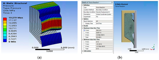 The contact pressure cloud diagram is shown in Figure 7a. The contact pressure at the main seal protrusion is the largest, the contact state is stable, the pressure gradually decreases to both sides; there is no fault, sudden change, and no leakage. The maximum pressure value is 18 MPa, greater than the fluid pressure, and has a sealing effect. As shown in Figure 7b, because the force of the rubber is not easy to analyze, the reaction force of the bearing support is used instead of the load on the sealing ring to analyze, and solve the contact area by command to get the seal gap width.