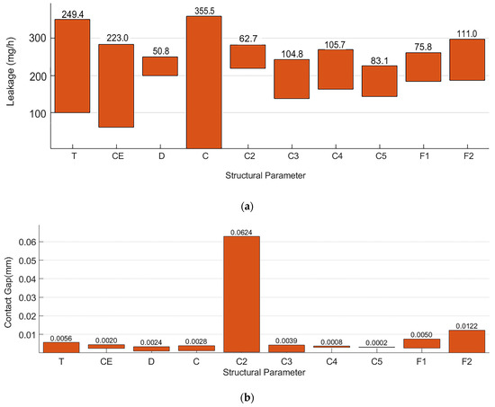 Comparison of influence of structural parameters: (a) Influence range of structural parameters on main seal leakage, and (b) Influence range of structural parameters on tip contact gap of sand flap.