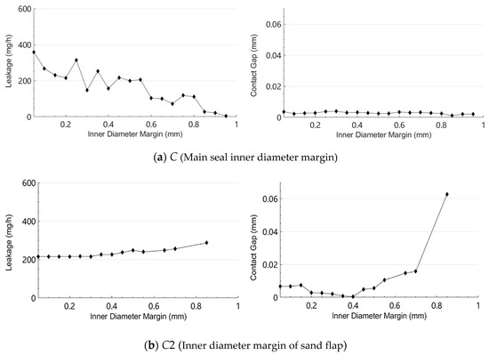 Figure 11 shows the influence of different structural parameters on sealing performance. As shown in Figure 11a, as the inner diameter margin increases, the leakage of the main seal gradually decreases, and the sealing performance is enhanced, while the contact gap at the tip of the sand retaining flap is almost unaffected. When the inner diameter margin is close to 1 mm, the contact pressure drops to 7 MPa, in this case, the main seal contact gap width also drops to 0.5 mm. Due to the complex bottom hole conditions, if a certain pressure fluctuation occurs, the sealing fluid will flow through. Therefore, the inner diameter margin of the main seal should be as large as possible, but at the same time, it is necessary to ensure that the contact pressure of the contact part is higher than the pressure on both sides of the sealing ring by a certain value to ensure that the sealing ring will not leak under pressure fluctuations.
