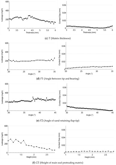 Figure 10b shows the influence range of various structural parameters on the contact clearance of the tip of the sand baffle. From the figure, it can be seen that the main structural parameters affecting the contact clearance of the tip of the sand baffle are the inner diameter allowance of the sand baffle, followed by the thickness of the seal ring base, the angle of the tip of the sand baffle, and the angle between the tip and the bearing. Consistent with the inner diameter allowance of the main seal, the inner diameter allowance of the sand flap also directly affects the compression state of the sand flap with the compression of the seal ring, and the tip angle of the sand flap directly affects the ability of the sand flap tip to resist deformation and warpage. It can be seen from Figure 10a that the influence of this parameter on the leakage of the main seal is relatively small and can be ignored. Therefore, in the design, it is only necessary to consider the influence of the two parameters on the tip contact clearance, and match the best structural parameters. As the support of the two main functional structures, the thickness of the sealing ring matrix also has a certain impact on the deformation of the two functional structures. Therefore, the thickness of the matrix also has a certain impact on the performance of the sand flap. The angle of the tip of the sand-retaining flap and the angle between the tip and the bearing are the main parameters that determine the structural shape of the sand-retaining flap, so they can also affect the performance of the sand-retaining flap.