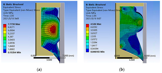 Figure 12 is the stress comparison before and after the optimization of the special-shaped seal ring. As shown in Figure 12a, the maximum local stress before optimization is 7.7738 MPa at the main seal. As shown in Figure 12b, the optimized stress distribution is relatively uniform, and there is no large, concentrated stress in the main seal part, which is beneficial to prolong the service life of the main seal. There is a local stress peak at the wheel contact position, the value is 4.526 MPa, but the area where the maximum stress value is located is lower than the stress value before optimization, so it does not increase the probability of failure of the sealing matrix. In general, the stress distribution of the optimized sealing ring is better than before, and the theoretical life of the sealing ring is longer.