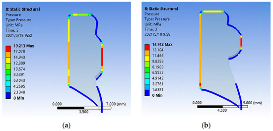 Take the well depth of 1000 m, the external mud pressure is about 11.76 MPa because the pressure difference between the inside and outside of the sealed cavity is 0.3~0.7 MPa [29], the safety factor is 2, and the internal pressure of the bearing is 13.16 MPa. Apply fluid load through APDL (ANSYS Parametric Design Language), the schematic diagram of the fluid pressure boundary is shown in Figure 6b.