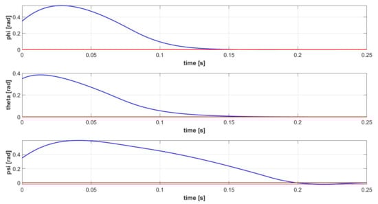 All the attitude stabilizers proposed in Section 2.2.1, Section 2.2.2, Section 2.2.3, Section 2.2.4, Section 2.2.5 are shown to be able to stabilize the nonlinear quadrotor attitude model, expressed by Equations (12)–(17), yet at different performance levels. All the simulations are performed considering the same initial condition for the plant, with the quadrotor having initial roll, pitch and yaw angles of 20° and initial roll, pitch and yaw rates of 10 rad/s. The gyroscopic effect is part of the nonlinear attitude dynamical system and is computed assuming a constant total lift force equal to the quadcopter’s weight in Equation (19). Figure 4, Figure 5, Figure 6, Figure 7 and Figure 8 show the Euler angles signals of the PID, LQR, FL, SMC and MPC-based attitude stabilizers, respectively.