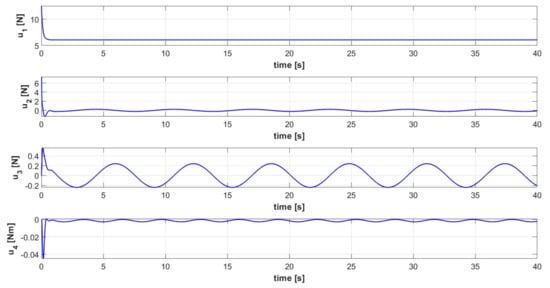 Control input signals [] of the controlled quadrotor system executing trajectory 1.