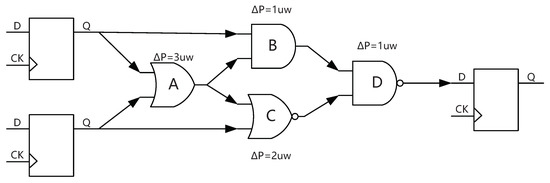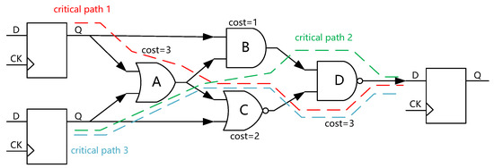 The gate-level dual-threshold static power-optimization methodology (GDSPOM) [17] provides a way to distribute threshold voltages at the gate level. The circuit’s initial state in this method is all-HVT. This method analyzes the timing by STA [25] and then swaps the cell with the highest cost to LVT, where the cost of the cell refers to the number of critical paths through it. This method then repeats the above operation of analyzing the timing and replacing the cell until the timing meets the constraints. For example, as shown in Figure 1, there are six paths in the design, three of which are critical. Cells A and D will be swapped to LVT first since their costs are the highest.