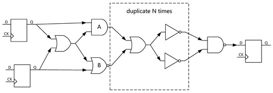 The critical paths reflect the timing state of the circuit, and the information provided by the critical paths is an important reference for threshold voltage distribution. However, the order of magnitude of the paths in the mesh structure is so large that traversing all critical paths is time-consuming or infeasible. For example, as shown in Figure 3, suppose that the structure in the dotted box is repeated 15 times. Currently, the maximum logic depth (the number of cells on one path) is , which is common in VLSI designs. When the structure inside the dashed box is not considered, the paths through A and B are 3 respectively. For each repetition of the structure inside the dashed box, the number of paths is multiplied by 2. Thus the number of paths is , while the cell number is . It means that the order of magnitude of the paths may be much larger than that of cells.