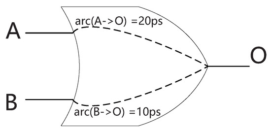 The CAPCOM method considers the cell delay without considering the path and uses the average delay of the cell as a parameter. However, the specific impact of the cell on a path needs to be considered. For example, in Figure 4, the delays of timing arc A--O and timing arc B--O are different. A significant difference exists between the cell delay on the path through pin A and the path through pin B.