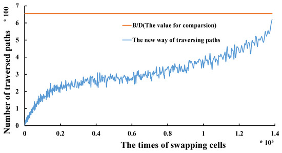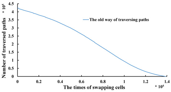 The relationship between the number of traversed paths and the times of swapping cells when using the new way.