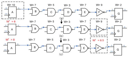 In this paper, the algorithm finds the critical path by R and then finds the most critical cell on this path by W. After that, update , , R, W, and repeat the above operation until the slack of all paths is greater than 0.