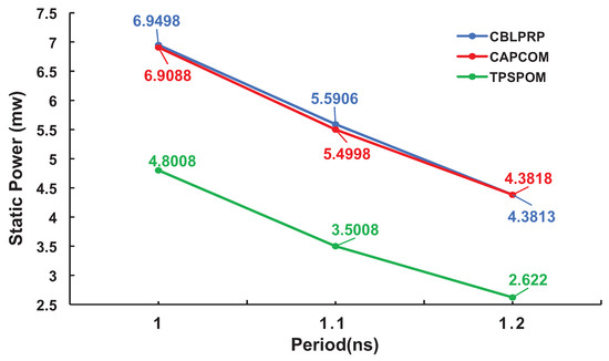 The results show that for static power consumption optimization, CAPCOM is slightly better than CBLPRP, while TPSPOM is significantly better than the other two methods. Moreover, the results indicate that under the shortest 1 ns delay constraint, compared to the all-LVT circuit, CBLPRP’s static power consumption is reduced to 35.12%, while CAPCOM’s is reduced to 34.91% and TPSPOM’s is reduced to 24.26%.