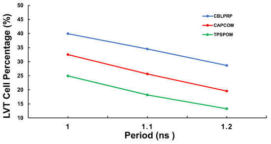 Percentage of LVT cells of the 28 nm circuit using CBLPRP, CAPCOM, and TPSPOM procedures with dual-threshold voltage.