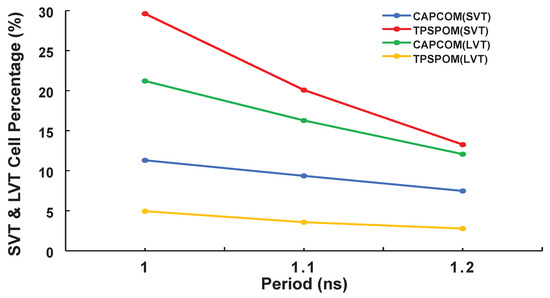 Percentage of SVT/LVT cell of the 28 nm circuit CAPCOM, and TPSPOM procedures with triple-threshold voltage.