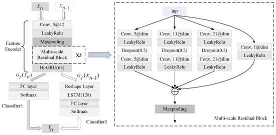 For pre-training, the proposed model is mainly built on a feature encoder and two classifiers. The feature encoder contains three multi-scale residual blocks and one bidirectional gated recurrent unit (GRU) layer whose cell size is set to 64 [23,24].