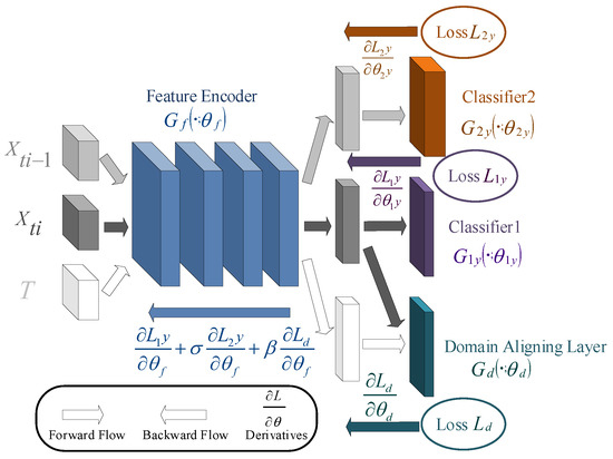 The architecture of the deep adaptation network used in this paper. Different colored arrows indicate the data flow and backpropagation of different branches.
