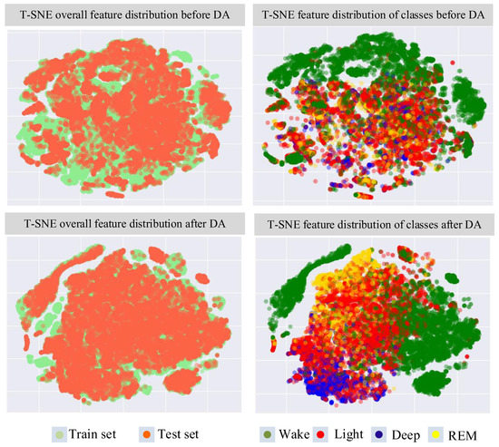 T-SNE results of SHHS2′s feature distribution extracted by the CNN block module before DA and after DA.