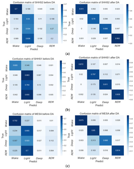 Confusion matrix of inter-subject sleep staging before and after domain adaptation based on the proposed network. (a) Confusion matrix for SHHS2, (b) confusion matrix for SHHS1, and (c) confusion matrix for MESA.