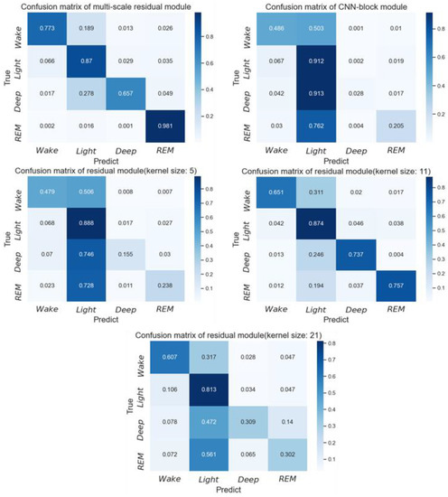 The model was trained on a dataset and then tested on another dataset to obtain the cross-dataset evaluation results. We tested a total of four cases, namely SHHS1 to MESA, SHHS2 to MESA, SHHS2 to SLPDB, and SHHS2 to SHHS1, as shown in Table 6. The table shows that both the accuracy rate and Kappa achieve a significant improvement across datasets compared to pre-DA and post-DA. We used different datasets (source domain) as the training set and tested the same dataset (target domain), which led to different results. For example, when SHHS1 and SHHS2 were used as the training set to train the model, respectively, the accuracy (Kappa) of MESA is 0.851(0.803) and 0.857(0.809) after adjusting the distribution. This may be related to the degree of distribution difference between different datasets, resulting from the collection environment and operation. According to the results in Table 3, the test result of MESA is 0.868 (0.840), which exceeds the result in the cross-dataset mode, which supports the notion that different acquisition conditions may also cause data distribution. Table 5 also shows the results of different feature encoders in the cross-dataset test. The proposed multi-scale residual module outperforms other feature encoders. The information at multiple scales provided by the multi-scale residual module can promote the performance of the model, whether it is on the data or across the data. When the training set comes from SHHS2, and the test set comes from SLPDB, the confusion matrix under different feature encoders is as shown in Figure 8. The multi-scale residual module achieves the highest accuracy for wake and REM. However, the accuracy for light sleep is the highest on the CNN block module, and the accuracy for deep sleep is the highest on the residual module with a kernel size of 11. However, the multi-scale residual module has the best overall performance in each class.